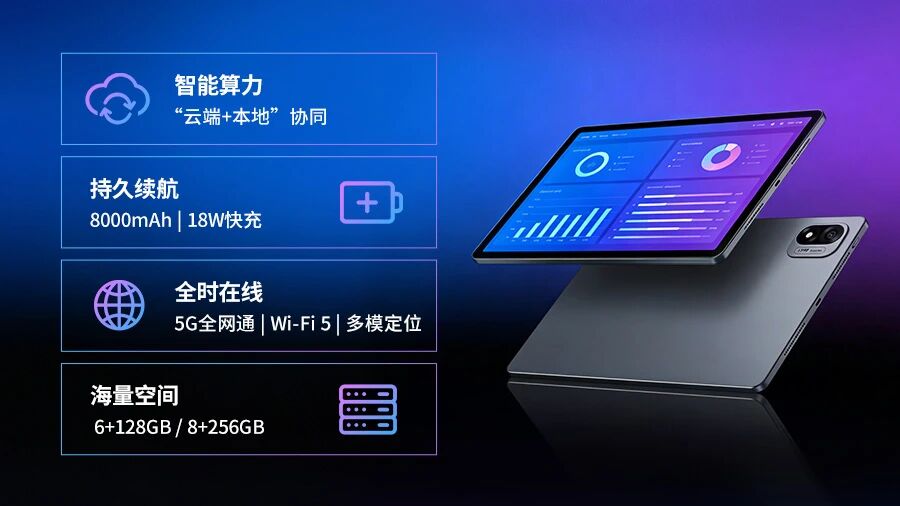 同时,设备支持 “云端 + 本地” 协同模式,能根据任务需求智能调配资源,轻松应对云办公、云游戏等多元场景。内置 8000mAh 大容量电池,搭配低功耗芯片与智能省电技术,续航持久耐用;更支持 18W 快充,快速回血,告别电量焦虑。存储方面,提供 6+128GB 与 8+256GB 两种版本,充分满足不同用户的容量需求。